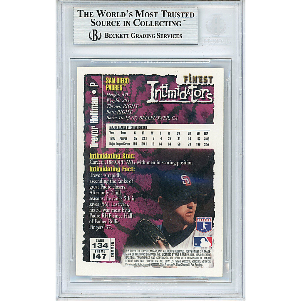 This autographed 'San Diego Padres' 1996 Topps Finest Intimidators insert baseball trading card B134 was signed by Trevor Hoffman in blue sharpie. It has been authenticated by a Beckett Authentication Services (BAS) expert and is encapsulated in a BGS tamper proof card protector. Authentication number 00011847525 can be verified at www.Beckett-Authentication.com. For more MLB and Baseball autographed collectibles, please browse our website. Notable career accomplishments include 7-time MLB All Star Game selection, 2-time National League Rolaids Relief Man Award winner, 2-time National League Saves Leader, having his jersey #51 retired by the San Diego Padres, induction into the San Diego Padres Hall of Fame and the Baseball Hall of Fame, and playing professionally for the SD Padres, Milwaukee Brewers, and Florida (Miami) Marlins.