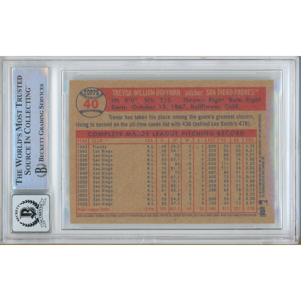 Experience a piece of baseball history with this Trevor Hoffman autographed 2006 Topps Heritage card. The San Diego Padres legend and Hall of Famer has signed this hard-signed card, which has been authenticated and graded by Beckett Authentication Services (BAS) and Beckett Grading Services (BGS) respectively. Don't miss out on the chance to add this must-have card to your collection. This Trevor Hoffman autograph, signed in blue Sharpie, is a perfect addition for any Padres fan or baseball card collector. Certificate #00016497005.