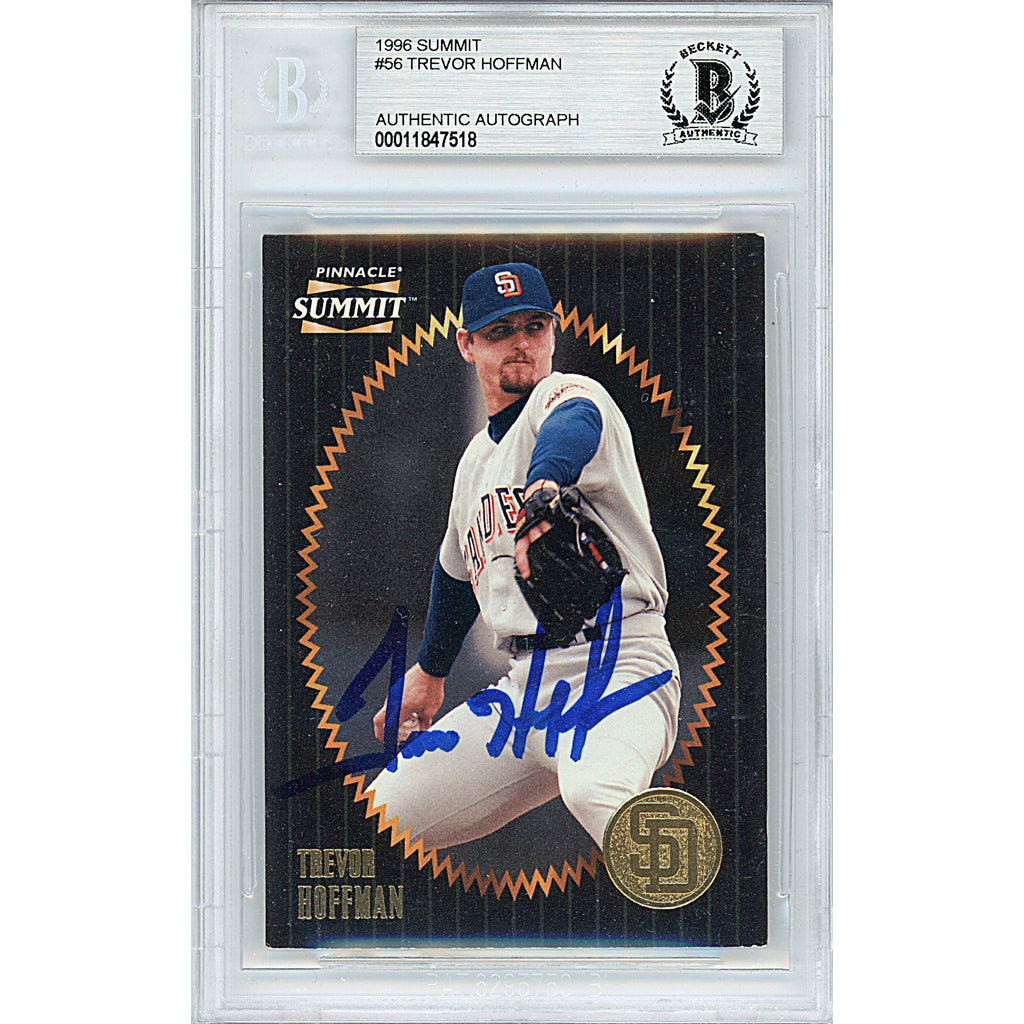 This autographed Trevor Hoffman baseball card from the 1996 Pinnacle Summit series features a bold signature in blue sharpie. It has been examined and authenticated by an expert from Beckett Authentication Services (BAS) and is enclosed in a tamper-proof BGS card protector. To verify its authenticity, visit www.Beckett-Authentication.com and enter the authentication number 00011847518. Click on the images to view them in detail and browse our website for more MLB and baseball autographed collectibles. Notable career accomplishments include 7-time MLB All-Star Game selection, 2-time National League Rolaids Relief Man Award winner, and 2-time National League saves leader. His jersey number 51 is retired by the San Diego Padres and he is a Hall of Fame inductee for both the Padres and the entire league. He played professionally for the Padres, Milwaukee Brewers, and Florida (Miami) Marlins.