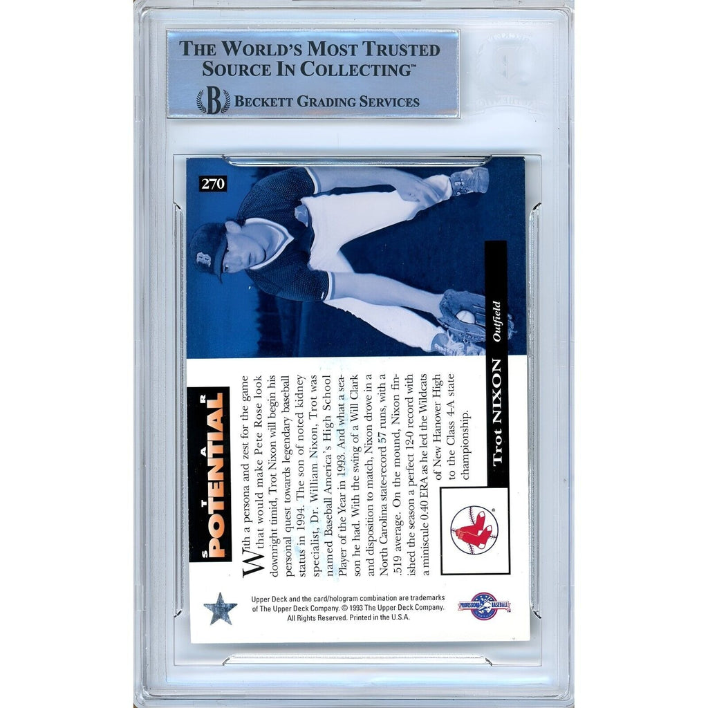 This 1994 Upper Deck Minor League Top Prospect trading card boasts the authenticated autograph of Trot Nixon, a former Major League Baseball player for the Boston Red Sox. Certified by Beckett Authentication Services (BAS) with authentication number 00016507758 and autographed in Blue Sharpie, this officially licensed card is a valuable addition to any sports trading card collection. Made with high-quality card stock material and authorized for distribution in the United States, this card is a must-have for fans of the Boston Red Sox or Trot Nixon.