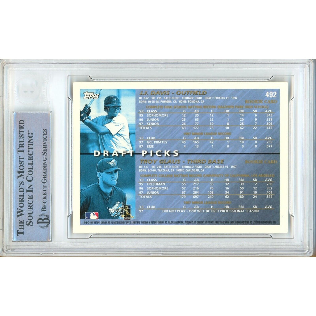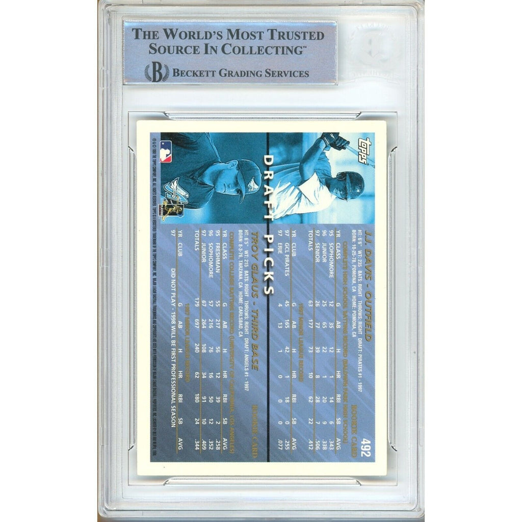 This rare 1998 Topps baseball rookie card, autographed by former major league player Troy Glaus of the LA Angels, features a hard ink autograph and has been authenticated by Beckett Authentication Services (BAS) in a slab design. Made with high-quality card stock material, this card bears a unique card number of 492 and is a valuable addition for collectors and fans of the sport, particularly those who appreciate Glaus's impact on the game and his career. It is a must-have for any dedicated collector and has been sourced from a dependable, respected provider. Preserve a piece of baseball history today by adding this autographed card, signed in blue sharpie, to your collection. Troy Glaus Autographed Los Angeles Angels 1998 Topps Rookie Baseball Card #492. Authenticated and encapsulated by the experts at Beckett Authentication Services (BAS). Certificate Number 00016507324.