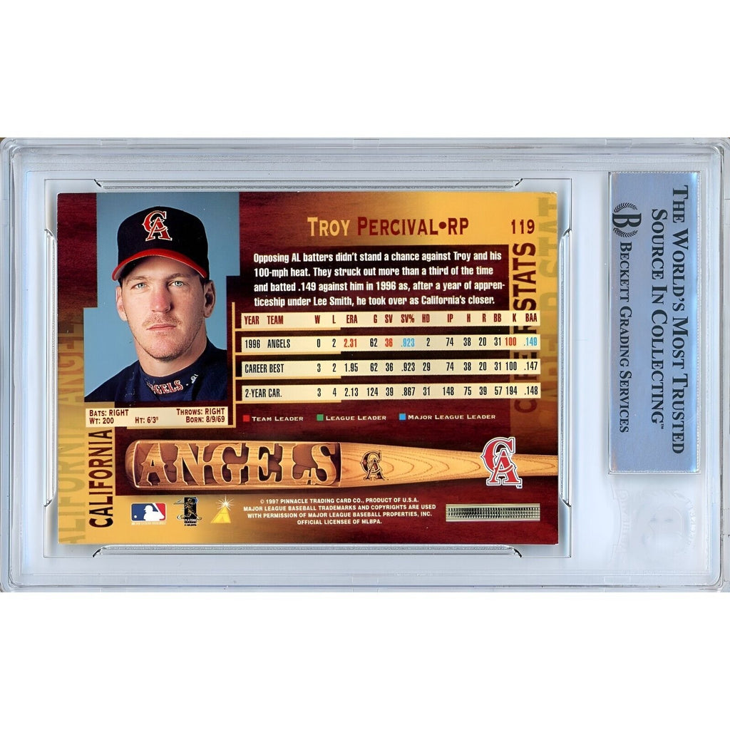 This 1997 Pinnacle baseball card showcases Troy Percival's on-card autograph, a former Major League Baseball player for the LA Angels. The card is a standard size and made of card stock material, and it is an original, licensed reprint with a BAS authentication number of 00016507840. A valuable item for collectors of baseball memorabilia, it will particularly appeal to fans of the Anaheim Angels, Detroit Tigers, or St. Louis Cardinals. This card was produced in the United States and is a must-have for any passionate sports trading card collector. Autographed in Black Sharpie. Troy Percival Autographed Los Angeles Angels 1997 Pinnacle Baseball Card #119. This signature has been authenticated and Encapsulated by the Experts at Beckett Authentication Services (BAS). Certificate Number 00016507840.